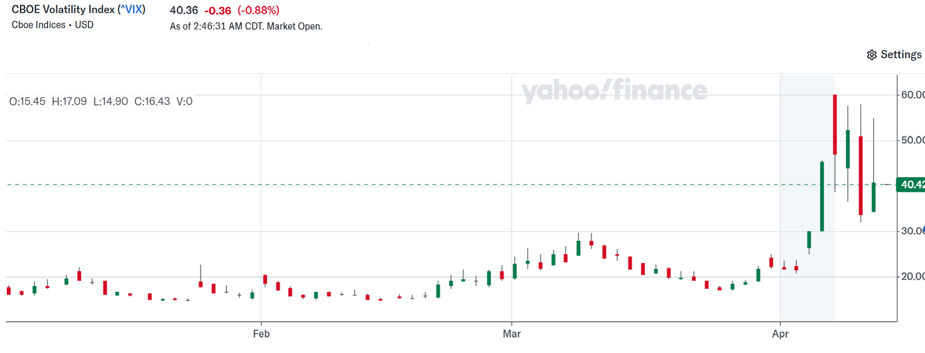 مصدر: من مستويات هادئة نسبيًا بالقرب من 14-15 في مارس، ارتفع مؤشر التذبذب المتذبذب (VIX) فوق مستوى 50 نقطة، وهي المستويات التي شوهدت آخر مرة في بداية الوباء. وجاءت هذه القفزة في أعقاب إعلان ترامب عن التعريفة الجمركية وعكست اندفاع المستثمرين للتحوط ضد المزيد من الخسائر. وقد تأرجح المؤشر بشكل كبير منذ ذلك الحين، مما يعكس عدم الاستقرار المتزايد.